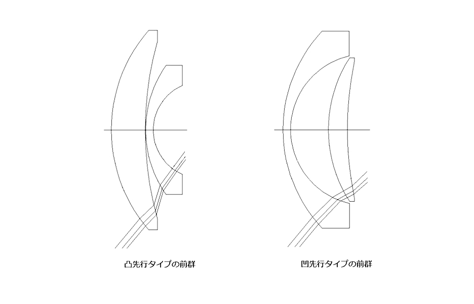 広角レンズの前玉(前群)には一般に2つのタイプが存在します。図2をご覧ください。1つは凸レンズ(正レンズ成分)から光学系が始まる「凸先行タイプ」です。そして、もう1つは凹レンズ(負レンズ成分)から始まる「凹先行タイプ」です。レンズに詳しい読者の皆さんは見覚えがあると思います。世界中の広角レンズから広角・標準ズームに至るまで、この2つのタイプに大別することができるのです。
