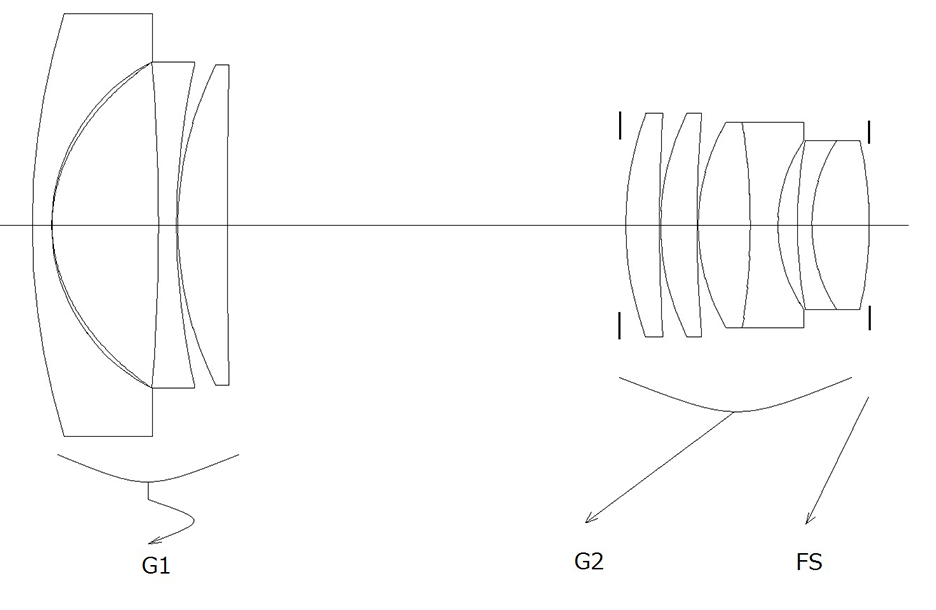 特徴的なことは開口絞り(Fnoを決定する絞り)が後群G2の外側、直前にあることです。この構成は収差補正が若干難しくなりますが、偏芯敏感度の高い後群を絞りによって分断することがないので、製造親和性が良く量産性能が安定します。また、最も像側にはフレアーストッパーFSを装備し、ズーミングの際に独立に動き、特に中間焦点距離領域から望遠側で発生する上方コマ収差によるコマフレアーを有効に取り除く効果があります。前群の第1レンズは複合型の非球面レンズです。このレンズは深い凹面に厚肉差の大きい非球面樹脂層を成形するために、製法はもとより専用の樹脂開発まで行い完成させました。またこのレンズの肝になるところは、各群の強い屈折力配置です。前群後群共に今までの常識的な屈折力より強い屈折力で使用しています。そのため第1レンズの強い負の屈折力と非球面形状が設計的な特徴になります。また、後群は、まず凸レンズ2枚と接合レンズの前方の凸レンズで球面収差、コマ収差を十分補正します。そして接合レンズ2枚の凹面を向い合せにすることによって、いわばトリプレットの中央の凹レンズ効果を持たせました。あたかもトリプレットの凹レンズが2枚に分割した形になっている為、公差に強くかつ像面湾曲および非点収差をさらに良好に補正することができたのです。このレンズは1995年に日本特許を出願しています。