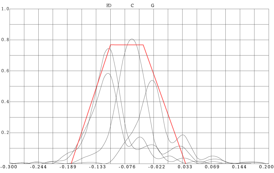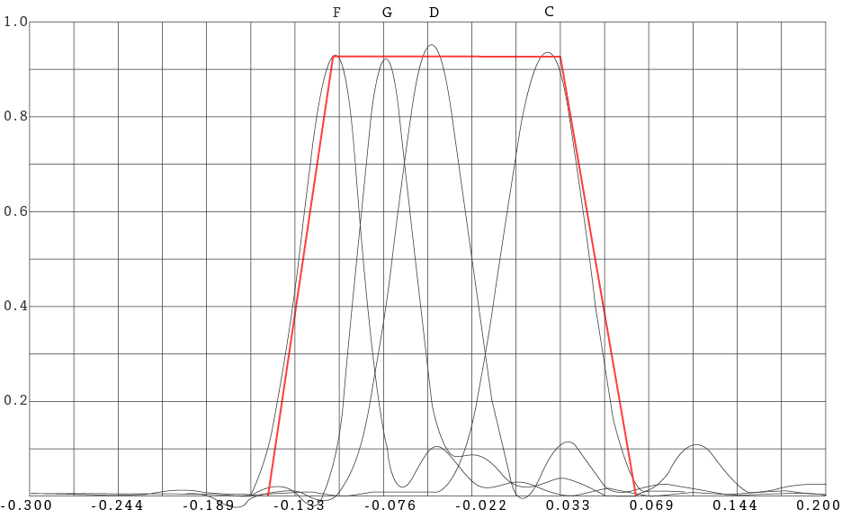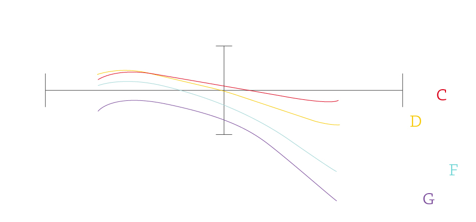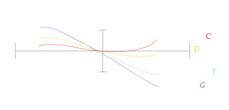 図1はガウスタイプの典型的な軸外の横収差図です。残差が見やすいように、あえてスケールを拡大しています。これは画面の周辺のある結像位置の収差を表しているとお考えください。色分けはしてあるのは各波長の横収差量です。DGCFはそれぞれd線(黄色)、g線(青紫)、c線(赤色)、F線(青色)を表しています。図1の横収差では各色のほとんどが直線に近く平行に並んでいます。その収差量(残差)は極僅かで拡大されているとお考えください。